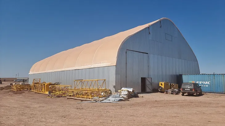 Ангар построен по каркасной технологии: металлический каркас из гнутосварных профилей толщиной 3–4 мм выдерживает снеговую нагрузку до 180 кг/м² и ветер до 30 м/с. Покрытие — двухслойный ПВХ плотностью 850 г/м² с УФ-защитой, антистатическим и огнестойким покрытием (класс НГ). Крепление — на болтовых соединениях, без сварки, что ускоряет монтаж и исключает коррозию. Все элементы — оцинкованные, устойчивые к влаге и перепадам температур.